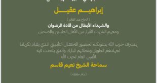 أكمل القراءة »إحياءً للذكرى السنوية الأولى للقائد الجهادي الكبير الشهيد الحاج إبراهيم عقيل (الحاج عبد القادر) والشهداء الأبطال من قادة الرضوان