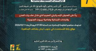 بِسْمِ اللَّـهِ الرحمن الرَّحِيمِ ﴿أُذِنَ لِلَّذِينَ يُقَاتَلُونَ بِأَنَّهُمْ ظُلِمُوا وَإِنَّ اللَّهَ عَلَىٰ نَصْرِهِمْ لَقَدِيرٌ الَّذِينَ أُخْرِجُوا مِن دِيَارِهِم بِغَيْرِ حَقٍّ إِلَّا أَن يَقُولُوا رَبُّنَا اللَّهُ﴾ صَدَقَ اللهُ العَلِيّ العَظِيم ردًّا على العدوان الإسرائيلي المجرم الذي طال عشرات المدن والبلدات اللبنانيّة بما فيها ضاحية بيروت الجنوبيّة، استهدف مجاهدو المقاومة الإسلامية عند الساعة 02:20 فجر اليوم الأربعاء 11/03/2026 تجمّعًا لقوّات جيش العدو …