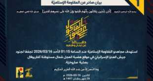 بِسْمِ اللَّـهِ الرحمن الرَّحِيمِ ﴿أُذِنَ لِلَّذِينَ يُقَاتَلُونَ بِأَنَّهُمْ ظُلِمُوا وَإِنَّ اللَّهَ عَلَىٰ نَصْرِهِمْ لَقَدِيرٌ﴾ صَدَقَ اللهُ العَلِيّ العَظِيم دفاعًا عن لبنان وشعبه، استهدف مجاهدو المُقاومة الإسلاميّة عند الساعة 02:35 الاثنين 16/03/2026 تجمّعًا لجنود جيش العدوّ الإسرائيليّ في موقع هضبة العجل شمال مستوطنة كفاريوفال للمرّة الثانية بصلية صاروخيّة. ﴿وَمَا النَّصْرُ إِلاَّ مِنْ عِندِ اللّهِ الْعَزِيزِ الْحَكِيم﴾ الاثنين 16-03-2026 26 رمضان 1447 …