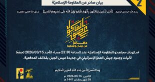 بِسْمِ اللَّـهِ الرحمن الرَّحِيمِ ﴿أُذِنَ لِلَّذِينَ يُقَاتَلُونَ بِأَنَّهُمْ ظُلِمُوا وَإِنَّ اللَّهَ عَلَىٰ نَصْرِهِمْ لَقَدِيرٌ﴾ صَدَقَ اللهُ العَلِيّ العَظِيم دفاعًا عن لبنان وشعبه، استهدف مجاهدو المُقاومة الإسلاميّة عند الساعة 17:00 الأحد 15/03/2026 تجمّعًا لآليات وجنود جيش العدوّ الإسرائيليّ عند تلة الخزان في بلدة العديسة عند الحدود اللبنانية الفلسطينية بقذائف المدفعيّة. ﴿وَمَا النَّصْرُ إِلاَّ مِنْ عِندِ اللّهِ الْعَزِيزِ الْحَكِيم﴾ الأحد 15-03-2026 25 …