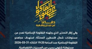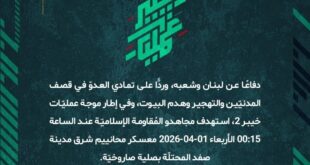 بِسْمِ اللَّـهِ الرحمن الرَّحِيمِ ﴿أُذِنَ لِلَّذِينَ يُقَاتَلُونَ بِأَنَّهُمْ ظُلِمُوا وَإِنَّ اللَّهَ عَلَىٰ نَصْرِهِمْ لَقَدِيرٌ﴾ صَدَقَ اللهُ العَلِيّ العَظِيم دفاعًا عن لبنان وشعبه، وردًّا على تمادي العدوّ في قصف المدنيّين والتهجير وهدم البيوت، وفي إطار موجة عمليّات خيبر 2، استهدف مجاهدو المُقاومة الإسلاميّة عند الساعة 00:15 الأربعاء 01-04-2026 معسكر محانييم شرق مدينة صفد المحتلّة بصلية صاروخيّة. ﴿وَمَا النَّصْرُ إِلاَّ مِنْ عِندِ …
