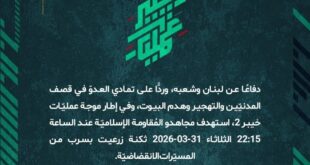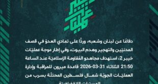 بِسْمِ اللَّـهِ الرحمن الرَّحِيمِ ﴿أُذِنَ لِلَّذِينَ يُقَاتَلُونَ بِأَنَّهُمْ ظُلِمُوا وَإِنَّ اللَّهَ عَلَىٰ نَصْرِهِمْ لَقَدِيرٌ﴾ صَدَقَ اللهُ العَلِيّ العَظِيم دفاعًا عن لبنان وشعبه، وردًّا على تمادي العدوّ في قصف المدنيّين والتهجير وهدم البيوت، وفي إطار موجة عمليّات خيبر 2، استهدف مجاهدو المُقاومة الإسلاميّة عند الساعة 21:50 الثلاثاء 31-03-2026 قاعدة ميرون للمراقبة وإدارة العمليّات الجويّة شمال فلسطين المحتلّة بسرب من المسيّرات الانقضاضيّة. …