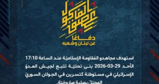 بِسْمِ اللَّـهِ الرحمن الرَّحِيمِ ﴿أُذِنَ لِلَّذِينَ يُقَاتَلُونَ بِأَنَّهُمْ ظُلِمُوا وَإِنَّ اللَّهَ عَلَىٰ نَصْرِهِمْ لَقَدِيرٌ﴾ صَدَقَ اللهُ العَلِيّ العَظِيم دفاعًا عن لبنان وشعبه، استهدف مجاهدو المُقاومة الإسلاميّة عند الساعة 17:10 الأحد 29-03-2026 بنى تحتيّة تتبع لجيش العدوّ الإسرائيليّ في مستوطنة كتسرين في الجولان السوريّ المحتلّ بصلية صاروخيّة. ﴿وَمَا النَّصْرُ إِلاَّ مِنْ عِندِ اللّهِ الْعَزِيزِ الْحَكِيم﴾ الأحد 29-03-2026 9 شوال 1447 هـ …