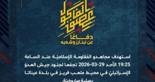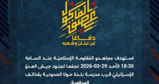 بِسْمِ اللَّـهِ الرحمن الرَّحِيمِ ﴿أُذِنَ لِلَّذِينَ يُقَاتَلُونَ بِأَنَّهُمْ ظُلِمُوا وَإِنَّ اللَّهَ عَلَىٰ نَصْرِهِمْ لَقَدِيرٌ﴾ صَدَقَ اللهُ العَلِيّ العَظِيم دفاعًا عن لبنان وشعبه، نفّذ مجاهدو المُقاومة الإسلاميّة عند الساعة 22:00 الأحد 29-03-2026 إغارة على قوّة إسرائيليّة متموضعة قرب حسينيّة بلدة مارون الراس الحدوديّة واشتبكوا معها بالأسلحة الخفيفة والمتوسّطة والقنّـــــاصات والقذائف الصاروخيّة المباشرة، ما أسفر عن تدمير دبّابة ميركافا ووقوع أفراد القوّة …