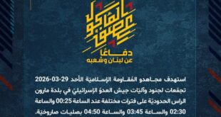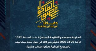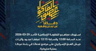 بِسْمِ اللَّـهِ الرحمن الرَّحِيمِ ﴿أُذِنَ لِلَّذِينَ يُقَاتَلُونَ بِأَنَّهُمْ ظُلِمُوا وَإِنَّ اللَّهَ عَلَىٰ نَصْرِهِمْ لَقَدِيرٌ﴾ صَدَقَ اللهُ العَلِيّ العَظِيم دفاعًا عن لبنان وشعبه، استهدف مجاهدو المُقاومة الإسلاميّة الأحد 29-03-2026 تجمّعات لجنود وآليّات جيش العدوّ الإسرائيليّ في بلدة مارون الراس الحدوديّة على فترات مختلفة عند الساعة 00:25 والساعة 02:30 والساعة 03:45 والساعة 04:50 بصليات صاروخيّة. ﴿وَمَا النَّصْرُ إِلاَّ مِنْ عِندِ اللّهِ الْعَزِيزِ …
