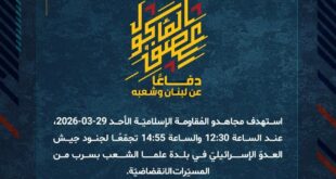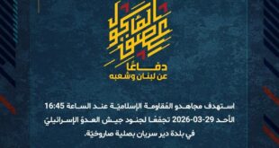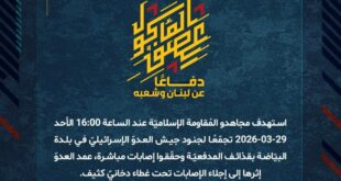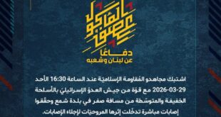 بِسْمِ اللَّـهِ الرحمن الرَّحِيمِ ﴿أُذِنَ لِلَّذِينَ يُقَاتَلُونَ بِأَنَّهُمْ ظُلِمُوا وَإِنَّ اللَّهَ عَلَىٰ نَصْرِهِمْ لَقَدِيرٌ﴾ صَدَقَ اللهُ العَلِيّ العَظِيم دفاعًا عن لبنان وشعبه، استهدف مجاهدو المُقاومة الإسلاميّة الأحد 29-03-2026، عند الساعة 12:30 والساعة 14:55 تجمّعًا لجنود جيش العدوّ الإسرائيليّ في بلدة علما الشعب بسرب من المسيّرات الانقضاضيّة. ﴿وَمَا النَّصْرُ إِلاَّ مِنْ عِندِ اللّهِ الْعَزِيزِ الْحَكِيم﴾ الأحد 29-03-2026 9 شوال 1447 هـ …