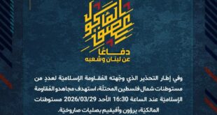 بِسْمِ اللَّـهِ الرحمن الرَّحِيمِ ﴿أُذِنَ لِلَّذِينَ يُقَاتَلُونَ بِأَنَّهُمْ ظُلِمُوا وَإِنَّ اللَّهَ عَلَىٰ نَصْرِهِمْ لَقَدِيرٌ﴾ صَدَقَ اللهُ العَلِيّ العَظِيم دفاعًا عن لبنان وشعبه، وفي إطار التحذير الذي وجّهته المُقاومة الإسلاميّة لعددٍ من مستوطنات شمال فلسطين المحتلّة، استهدف مجاهدو المُقاومة الإسلاميّة عند الساعة 16:30 الأحد 29/03/2026 مستوطنات المالكيّة، يرؤون وأفيفيم بصليات صاروخيّة. ﴿وَمَا النَّصْرُ إِلاَّ مِنْ عِندِ اللّهِ الْعَزِيزِ الْحَكِيم﴾ الأحد 29-03-2026 …