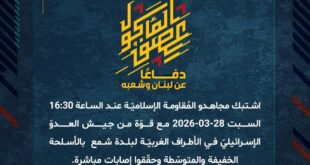 بِسْمِ اللَّـهِ الرحمن الرَّحِيمِ ﴿أُذِنَ لِلَّذِينَ يُقَاتَلُونَ بِأَنَّهُمْ ظُلِمُوا وَإِنَّ اللَّهَ عَلَىٰ نَصْرِهِمْ لَقَدِيرٌ﴾ صَدَقَ اللهُ العَلِيّ العَظِيم دفاعًا عن لبنان وشعبه، اشتبك مجاهدو المُقاومة الإسلاميّة عند الساعة 16:30 السبت 28-03-2026 مع قوّة من جيش العدوّ الإسرائيليّ في الأطراف الغربيّة لبلدة شمع بالأسلحة الخفيفة والمتوسّطة وحقّقوا إصابات مباشرة. ﴿وَمَا النَّصْرُ إِلاَّ مِنْ عِندِ اللّهِ الْعَزِيزِ الْحَكِيم﴾ السبت 28-03-2026 8 شوال …