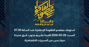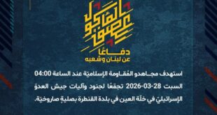 بِسْمِ اللَّـهِ الرحمن الرَّحِيمِ ﴿أُذِنَ لِلَّذِينَ يُقَاتَلُونَ بِأَنَّهُمْ ظُلِمُوا وَإِنَّ اللَّهَ عَلَىٰ نَصْرِهِمْ لَقَدِيرٌ﴾ صَدَقَ اللهُ العَلِيّ العَظِيم دفاعًا عن لبنان وشعبه، وردًّا على تمادي العدوّ في قصف المدنيّين والتهجير وهدم البيوت، استهدف مجاهدو المُقاومة الإسلاميّة عند الساعة 23:45 أمس السبت 28-03-2026 قاعدة رغفيم (قاعدة عسكريّة تحوي معسكرات تدريب للواء غولاني) تبعد عن الحدود اللبنانيّة الفلسطينيّة 65 كلم، جنوب شرق …