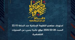 بِسْمِ اللَّـهِ الرحمن الرَّحِيمِ ﴿أُذِنَ لِلَّذِينَ يُقَاتَلُونَ بِأَنَّهُمْ ظُلِمُوا وَإِنَّ اللَّهَ عَلَىٰ نَصْرِهِمْ لَقَدِيرٌ﴾ صَدَقَ اللهُ العَلِيّ العَظِيم دفاعًا عن لبنان وشعبه، وردًّا على تمادي العدوّ في قصف المدنيّين والتهجير وهدم البيوت، استهدف مجاهدو المُقاومة الإسلاميّة عند الساعة 23:45 أمس السبت 28-03-2026 قـــاعدة عيــن شــــيــمر (قاعدة للدفاع الجوّيّ الصاروخيّ) تبعد 75 كلم عن الحدود اللبنانيّة الفلسطينيّة بصليةٍ من الصواريخ النوعيّة. …