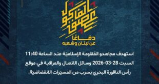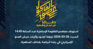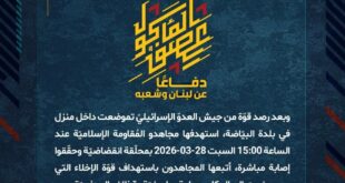 بِسْمِ اللَّـهِ الرحمن الرَّحِيمِ ﴿أُذِنَ لِلَّذِينَ يُقَاتَلُونَ بِأَنَّهُمْ ظُلِمُوا وَإِنَّ اللَّهَ عَلَىٰ نَصْرِهِمْ لَقَدِيرٌ﴾ صَدَقَ اللهُ العَلِيّ العَظِيم دفاعًا عن لبنان وشعبه، وبعد رصد قوّة من جيش العدوّ الإسرائيليّ تموضعت داخل منزل في بلدة البيّاضة، استهدفها مجاهدو المُقاومة الإسلاميّة عند الساعة 15:00 السبت 28-03-2026 بمحلّقة انقضاضيّة وحقّقوا إصابة مباشرة، أتبعها المجاهدون باستهداف قوّة الإخلاء التي حضرت إلى المكان بصلية صاروخيّة …