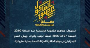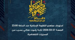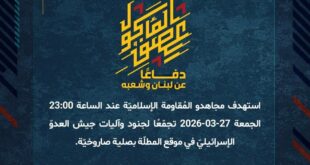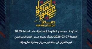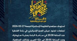 بِسْمِ اللَّـهِ الرحمن الرَّحِيمِ ﴿أُذِنَ لِلَّذِينَ يُقَاتَلُونَ بِأَنَّهُمْ ظُلِمُوا وَإِنَّ اللَّهَ عَلَىٰ نَصْرِهِمْ لَقَدِيرٌ﴾ صَدَقَ اللهُ العَلِيّ العَظِيم دفاعًا عن لبنان وشعبه، استهدف مجاهدو المُقاومة الإسلاميّة الجمعة 27-03-2026 تجمّعات لجنود جيش العدوّ الإسرائيليّ في بلدة القنطرة عند الساعة 20:30 في ساحة البلدة بصلية صاروخيّة، وعند الساعة 20:55 في خلّة العين بقذائف المدفعيّة. ﴿وَمَا النَّصْرُ إِلاَّ مِنْ عِندِ اللّهِ الْعَزِيزِ الْحَكِيم﴾ …