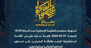 بِسْمِ اللَّـهِ الرحمن الرَّحِيمِ ﴿أُذِنَ لِلَّذِينَ يُقَاتَلُونَ بِأَنَّهُمْ ظُلِمُوا وَإِنَّ اللَّهَ عَلَىٰ نَصْرِهِمْ لَقَدِيرٌ﴾ صَدَقَ اللهُ العَلِيّ العَظِيم دفاعًا عن لبنان وشعبه، استهدف مجاهدو المُقاومة الإسلاميّة عند الساعة 18:30 الجمعة 27-03-2026 قاعدة ستيلا ماريس (قاعدة استراتيجيّة للرصد والرقابة البحريَّين على مستوى الساحل الشمالي) بصاروخ نوعيّ. ﴿وَمَا النَّصْرُ إِلاَّ مِنْ عِندِ اللّهِ الْعَزِيزِ الْحَكِيم﴾ الجمعة 27-03-2026 7 شوال 1447 هـ #معركة_العصف_المأكول …