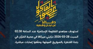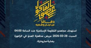 بِسْمِ اللَّـهِ الرحمن الرَّحِيمِ ﴿أُذِنَ لِلَّذِينَ يُقَاتَلُونَ بِأَنَّهُمْ ظُلِمُوا وَإِنَّ اللَّهَ عَلَىٰ نَصْرِهِمْ لَقَدِيرٌ﴾ صَدَقَ اللهُ العَلِيّ العَظِيم بعد رصد تحرّكات قوّة من جيش العدوّ الإسرائيليّ عند بيدر الفقعاني في بلدة الطيبة تتقدّم نزولاً باتّجاه مجرى نهر الليطاني في منطقة بيدر النهر، استدرجها مجاهدو المقاومة الإسلاميّة عند الساعة 00:30 السبت 28-03-2026 إلى كمين ناريّ مُحكم وقاموا باستهدافها بالأسلحة الصاروخيّة والقذائف …