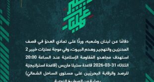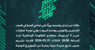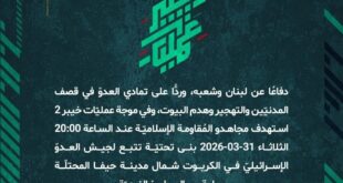 بِسْمِ اللَّـهِ الرحمن الرَّحِيمِ ﴿أُذِنَ لِلَّذِينَ يُقَاتَلُونَ بِأَنَّهُمْ ظُلِمُوا وَإِنَّ اللَّهَ عَلَىٰ نَصْرِهِمْ لَقَدِيرٌ﴾ صَدَقَ اللهُ العَلِيّ العَظِيم دفاعًا عن لبنان وشعبه، وردًّا على تمادي العدوّ في قصف المدنيّين والتهجير وهدم البيوت، وفي موجة عمليّات خيبر 2، استهدف مجاهدو المُقاومة الإسلاميّة عند الساعة 20:00 الثلاثاء 31-03-2026 قاعدة نشريم جنوب شرق مدينة حيفا بصلية من الصواريخ النوعيّة وسرب من المسيّرات الانقضاضيّة. …