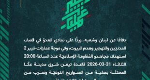 بِسْمِ اللَّـهِ الرحمن الرَّحِيمِ ﴿أُذِنَ لِلَّذِينَ يُقَاتَلُونَ بِأَنَّهُمْ ظُلِمُوا وَإِنَّ اللَّهَ عَلَىٰ نَصْرِهِمْ لَقَدِيرٌ﴾ صَدَقَ اللهُ العَلِيّ العَظِيم دفاعًا عن لبنان وشعبه، وردًّا على تمادي العدوّ في قصف المدنيّين والتهجير وهدم البيوت، وفي موجة عمليّات خيبر 2، وفي إطار التحذير الذي وجّهته المُقاومة الإسلاميّة لعددٍ من مستوطنات شمال فلسطين المحتلة، استهدف مجاهدو المُقاومة الإسلاميّة عند الساعة 20:00 الثلاثاء 31-03-2026 مستوطنة …