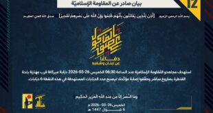 بِسْمِ اللَّـهِ الرحمن الرَّحِيمِ ﴿أُذِنَ لِلَّذِينَ يُقَاتَلُونَ بِأَنَّهُمْ ظُلِمُوا وَإِنَّ اللَّهَ عَلَىٰ نَصْرِهِمْ لَقَدِيرٌ﴾ صَدَقَ اللهُ العَلِيّ العَظِيم دفاعًا عن لبنان وشعبه، استهدف مجاهدو المُقاومة الإسلاميّة عند الساعة 06:30 الخميس 26-03-2026 دبّابة ميركافا قرب مِهَنيّة بلدة القنطرة بصاروخ مباشر وحقّقوا إصابة مؤكّدة، ليصبح عدد الدبّابات المستهدفة في هذه النقطة 6 دبّابات. ﴿وَمَا النَّصْرُ إِلاَّ مِنْ عِندِ اللّهِ الْعَزِيزِ الْحَكِيم﴾ الخميس …