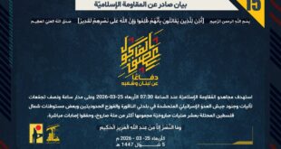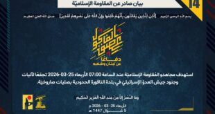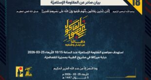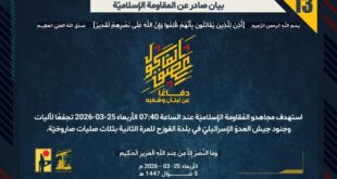 بِسْمِ اللَّـهِ الرحمن الرَّحِيمِ ﴿أُذِنَ لِلَّذِينَ يُقَاتَلُونَ بِأَنَّهُمْ ظُلِمُوا وَإِنَّ اللَّهَ عَلَىٰ نَصْرِهِمْ لَقَدِيرٌ﴾ صَدَقَ اللهُ العَلِيّ العَظِيم دفاعًا عن لبنان وشعبه، تصدّى مجاهدو المقاومة الإسلامية في وحدة الدفاع الجوي عند الساعة 17:30 أمس الثلاثاء 24-3-2026 لطائرة حربية إسرائيلية أثناء اعتدائها على جنوب لبنان، بصواريخ أرض جو، وأجبروها على التراجع. ﴿وَمَا النَّصْرُ إِلاَّ مِنْ عِندِ اللّهِ الْعَزِيزِ الْحَكِيم﴾ الأربعاء 25-03-2026 …