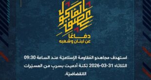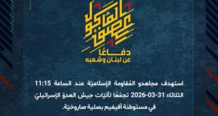 بِسْمِ اللَّـهِ الرحمن الرَّحِيمِ ﴿أُذِنَ لِلَّذِينَ يُقَاتَلُونَ بِأَنَّهُمْ ظُلِمُوا وَإِنَّ اللَّهَ عَلَىٰ نَصْرِهِمْ لَقَدِيرٌ﴾ صَدَقَ اللهُ العَلِيّ العَظِيم دفاعًا عن لبنان وشعبه، استهدف مجاهدو المُقاومة الإسلاميّة عند الساعة 04:30 الثلاثاء 31-03-2026 تجمّعًا لجنود وآليّات جيش العدوّ الإسرائيليّ عند مثلّث السدر – فريز في بلدة عيناتا بصلية صاروخيّة. ﴿وَمَا النَّصْرُ إِلاَّ مِنْ عِندِ اللّهِ الْعَزِيزِ الْحَكِيم﴾ الثّلاثاء 31-03-2026 11 شوال 1447 …
