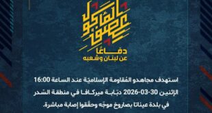بِسْمِ اللَّـهِ الرحمن الرَّحِيمِ ﴿أُذِنَ لِلَّذِينَ يُقَاتَلُونَ بِأَنَّهُمْ ظُلِمُوا وَإِنَّ اللَّهَ عَلَىٰ نَصْرِهِمْ لَقَدِيرٌ﴾ صَدَقَ اللهُ العَلِيّ العَظِيم دفاعًا عن لبنان وشعبه، استهدف مجاهدو المُقاومة الإسلاميّة عند الساعة 23:00 أمس الإثنين 30-03-2026 دبّابة ميركافا على طريق بلدتي القنطرة الطيبة في جنوب لبنان بصاروخ موجّه وشوهدت تحترق، ما استدعى حضور قوّة لإخلاء الإصابات وسحب الدبّابة تحت غطاء دخانيّ كثيف تزامن مع …