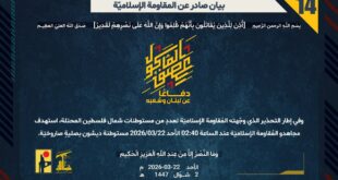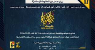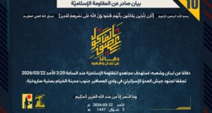 بِسْمِ اللَّـهِ الرحمن الرَّحِيمِ ﴿أُذِنَ لِلَّذِينَ يُقَاتَلُونَ بِأَنَّهُمْ ظُلِمُوا وَإِنَّ اللَّهَ عَلَىٰ نَصْرِهِمْ لَقَدِيرٌ﴾ صَدَقَ اللهُ العَلِيّ العَظِيم دفاعًا عن لبنان وشعبه، وفي إطار التحذير الذي وجّهته المُقاومة الإسلاميّة لعددٍ من مستوطنات شمال فلسطين المحتلة، استهدف مجاهدو المُقاومة الإسلاميّة عند الساعة 02:40 الأحد 22/03/2026 مستوطنة ديشون بصليةٍ صاروخيّة. ﴿وَمَا النَّصْرُ إِلاَّ مِنْ عِندِ اللّهِ الْعَزِيزِ الْحَكِيم﴾ الأحد 22-03-2026 2 شوال …