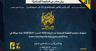 بِسْمِ اللَّـهِ الرحمن الرَّحِيمِ ﴿أُذِنَ لِلَّذِينَ يُقَاتَلُونَ بِأَنَّهُمْ ظُلِمُوا وَإِنَّ اللَّهَ عَلَىٰ نَصْرِهِمْ لَقَدِيرٌ﴾ صَدَقَ اللهُ العَلِيّ العَظِيم دفاعًا عن لبنان وشعبه، استهدف مجاهدو المُقاومة الإسلاميّة عند الساعة 15:00 السبت 21-03-2026 تجمّعًا لجنود جيش العدوّ الإسرائيليّ في موقع هضبة العجل شمال مستوطنة كفاريوفال للمرّة الثانية بصليةٍ صاروخيّة. ﴿وَمَا النَّصْرُ إِلاَّ مِنْ عِندِ اللّهِ الْعَزِيزِ الْحَكِيم﴾ السبت 21-03-2026 1 شوّال 1447 …