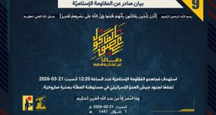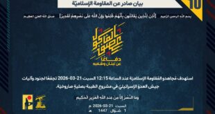 بِسْمِ اللَّـهِ الرحمن الرَّحِيمِ ﴿أُذِنَ لِلَّذِينَ يُقَاتَلُونَ بِأَنَّهُمْ ظُلِمُوا وَإِنَّ اللَّهَ عَلَىٰ نَصْرِهِمْ لَقَدِيرٌ﴾ صَدَقَ اللهُ العَلِيّ العَظِيم دفاعًا عن لبنان وشعبه، لا تزال الاشتباكات التي يخوضها مجاهدو المُقاومة الإسلاميّة في مدينة الخيام مُستمرّة منذ الساعة 10:00 السبت 21-03-2026 في حي الجلاحيّة والحارة الشرقيّة للمدينة بالأسلحة الخفيفة والمتوسّطة والقذائف الصاروخيّة. ﴿وَمَا النَّصْرُ إِلاَّ مِنْ عِندِ اللّهِ الْعَزِيزِ الْحَكِيم﴾ السبت 21-03-2026 …