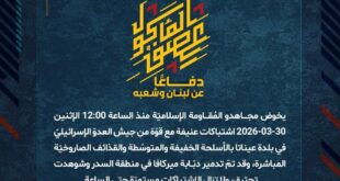 بِسْمِ اللَّـهِ الرحمن الرَّحِيمِ ﴿أُذِنَ لِلَّذِينَ يُقَاتَلُونَ بِأَنَّهُمْ ظُلِمُوا وَإِنَّ اللَّهَ عَلَىٰ نَصْرِهِمْ لَقَدِيرٌ﴾ صَدَقَ اللهُ العَلِيّ العَظِيم دفاعًا عن لبنان وشعبه، يخوض مجاهدو المُقاومة الإسلاميّة منذ الساعة 12:00 الإثنين 30-03-2026 اشتباكات عنيفة مع قوّة من جيش العدوّ الإسرائيليّ في بلدة عيناتا بالأسلحة الخفيفة والمتوسّطة والقذائف الصاروخيّة المباشرة، وقد تمّ تدمير دبّابة ميركافا في منطقة السدر وشوهدت تحترق، ولا تزال …