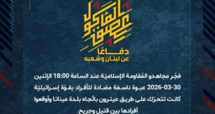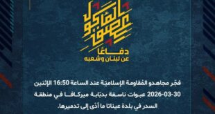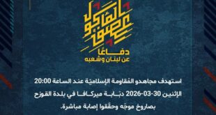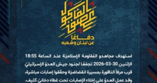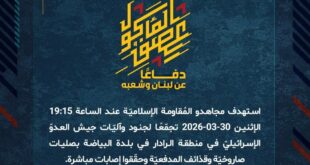 بِسْمِ اللَّـهِ الرحمن الرَّحِيمِ ﴿أُذِنَ لِلَّذِينَ يُقَاتَلُونَ بِأَنَّهُمْ ظُلِمُوا وَإِنَّ اللَّهَ عَلَىٰ نَصْرِهِمْ لَقَدِيرٌ﴾ صَدَقَ اللهُ العَلِيّ العَظِيم دفاعًا عن لبنان وشعبه، استهدف مجاهدو المُقاومة الإسلاميّة عند الساعة 18:55 الإثنين 30-03-2026 تجمّعًا لجنود جيش العدوّ الإسرائيليّ قرب مرفأ الناقورة بمسيّرة انقضاضيّة وحقّقوا إصابات مباشرة، وقد عمل العدوّ على إخلاء الإصابات تحت غطاء دخانيّ كثيف. ﴿وَمَا النَّصْرُ إِلاَّ مِنْ عِندِ اللّهِ …