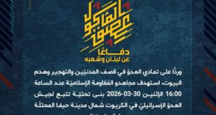 بِسْمِ اللَّـهِ الرحمن الرَّحِيمِ ﴿أُذِنَ لِلَّذِينَ يُقَاتَلُونَ بِأَنَّهُمْ ظُلِمُوا وَإِنَّ اللَّهَ عَلَىٰ نَصْرِهِمْ لَقَدِيرٌ﴾ صَدَقَ اللهُ العَلِيّ العَظِيم دفاعًا عن لبنان وشعبه، وردًّا على تمادي العدوّ في قصف المدنيّين والتهجير وهدم البيوت، استهدف مجاهدو المُقاومة الإسلاميّة عند الساعة 16:00 الإثنين 30-03-2026 بنى تحتيّة تتبع لجيش العدوّ الإسرائيليّ في الكريوت شمال مدينة حيفا المحتلّة بصليةٍ صاروخيّة. ﴿وَمَا النَّصْرُ إِلاَّ مِنْ عِندِ …