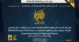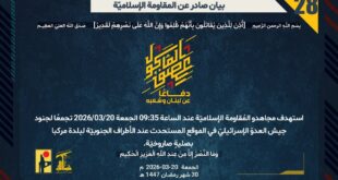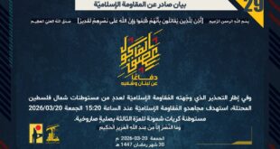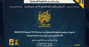 بِسْمِ اللَّـهِ الرحمن الرَّحِيمِ ﴿أُذِنَ لِلَّذِينَ يُقَاتَلُونَ بِأَنَّهُمْ ظُلِمُوا وَإِنَّ اللَّهَ عَلَىٰ نَصْرِهِمْ لَقَدِيرٌ﴾ صَدَقَ اللهُ العَلِيّ العَظِيم دفاعًا عن لبنان وشعبه، وفي إطار التحذير الذي وجّهته المُقاومة الإسلاميّة لعددٍ من مستوطنات شمال فلسطين المحتلة، استهدف مجاهدو المُقاومة الإسلاميّة عند الساعة 16:25 الجمعة 20/03/2026 مستوطنة كريات شمونة للمرّة الرابعة بصليةٍ صاروخية. ﴿وَمَا النَّصْرُ إِلاَّ مِنْ عِندِ اللّهِ الْعَزِيزِ الْحَكِيم﴾ الجمعة …