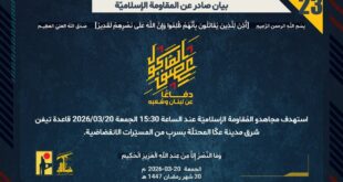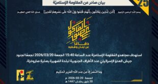 بِسْمِ اللَّـهِ الرحمن الرَّحِيمِ ﴿أُذِنَ لِلَّذِينَ يُقَاتَلُونَ بِأَنَّهُمْ ظُلِمُوا وَإِنَّ اللَّهَ عَلَىٰ نَصْرِهِمْ لَقَدِيرٌ﴾ صَدَقَ اللهُ العَلِيّ العَظِيم دفاعًا عن لبنان وشعبه، وفي إطار التحذير الذي وجّهته المُقاومة الإسلاميّة لعددٍ من مستوطنات شمال فلسطين المحتلة، استهدف مجاهدو المُقاومة الإسلاميّة عند الساعة 15:00 الجمعة 20/03/2026 مستوطنة كريات شمونة بسربٍ من المسيّرات الانقضاضية. ﴿وَمَا النَّصْرُ إِلاَّ مِنْ عِندِ اللّهِ الْعَزِيزِ الْحَكِيم﴾ الجمعة …