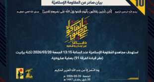 بِسْمِ اللَّـهِ الرحمن الرَّحِيمِ ﴿أُذِنَ لِلَّذِينَ يُقَاتَلُونَ بِأَنَّهُمْ ظُلِمُوا وَإِنَّ اللَّهَ عَلَىٰ نَصْرِهِمْ لَقَدِيرٌ﴾ صَدَقَ اللهُ العَلِيّ العَظِيم دفاعًا عن لبنان وشعبه، وفي إطار التحذير الذي وجّهته المُقاومة الإسلاميّة لعددٍ من مستوطنات شمال فلسطين المحتلة، استهدف مجاهدو المُقاومة الإسلاميّة عند الساعة 12:20 الجمعة 20/03/2026 مستوطنة راموت نفتالي بصلية صاروخيّة. ﴿وَمَا النَّصْرُ إِلاَّ مِنْ عِندِ اللّهِ الْعَزِيزِ الْحَكِيم﴾ الجمعة 20-03-2026 30 …