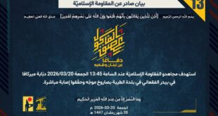 بِسْمِ اللَّـهِ الرحمن الرَّحِيمِ ﴿أُذِنَ لِلَّذِينَ يُقَاتَلُونَ بِأَنَّهُمْ ظُلِمُوا وَإِنَّ اللَّهَ عَلَىٰ نَصْرِهِمْ لَقَدِيرٌ﴾ صَدَقَ اللهُ العَلِيّ العَظِيم دفاعًا عن لبنان وشعبه، وفي إطار التحذير الذي وجّهته المُقاومة الإسلاميّة لعددٍ من مستوطنات شمال فلسطين المحتلة، استهدف مجاهدو المُقاومة الإسلاميّة عند الساعة 13:15 الجمعة 20/03/2026 مستوطنة نطوعا بصلية صاروخيّة. ﴿وَمَا النَّصْرُ إِلاَّ مِنْ عِندِ اللّهِ الْعَزِيزِ الْحَكِيم﴾ الجمعة 20-03-2026 30 رمضان …