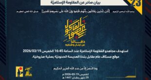 بِسْمِ اللَّـهِ الرحمن الرَّحِيمِ ﴿أُذِنَ لِلَّذِينَ يُقَاتَلُونَ بِأَنَّهُمْ ظُلِمُوا وَإِنَّ اللَّهَ عَلَىٰ نَصْرِهِمْ لَقَدِيرٌ﴾ صَدَقَ اللهُ العَلِيّ العَظِيم دفاعًا عن لبنان وشعبه، وفي إطار التحذير الذي وجّهته المُقاومة الإسلاميّة لمستوطنة كريات شمونة شمال فلسطين المحتلّة، استهدفها مجاهدو المُقاومة الإسلاميّة عند الساعة 22:00 الخميس 19/03/2026 للمرّة السابعة بصلية صاروخيّة. ﴿وَمَا النَّصْرُ إِلاَّ مِنْ عِندِ اللّهِ الْعَزِيزِ الْحَكِيم﴾ الخميس 19-03-2026 29 رمضان …