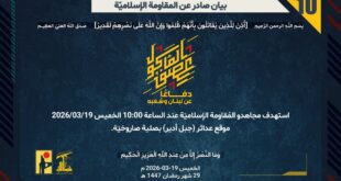 بِسْمِ اللَّـهِ الرحمن الرَّحِيمِ ﴿أُذِنَ لِلَّذِينَ يُقَاتَلُونَ بِأَنَّهُمْ ظُلِمُوا وَإِنَّ اللَّهَ عَلَىٰ نَصْرِهِمْ لَقَدِيرٌ﴾ صَدَقَ اللهُ العَلِيّ العَظِيم دفاعًا عن لبنان وشعبه، استهدف مجاهدو المُقاومة الإسلاميّة عند الساعة 15:30 الخميس 19/03/2026 تجمّعًا لجنود جيش العدوّ الإسرائيليّ في موقع هضبة العجل شمال مستوطنة كفاريوفال بسربٍ من المسيّرات الانقضاضيّة. ﴿وَمَا النَّصْرُ إِلاَّ مِنْ عِندِ اللّهِ الْعَزِيزِ الْحَكِيم﴾ الخميس 19-03-2026 29 رمضان 1447 …