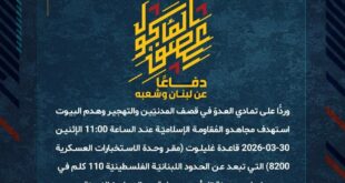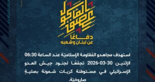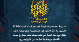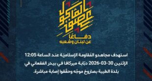 بِسْمِ اللَّـهِ الرحمن الرَّحِيمِ ﴿أُذِنَ لِلَّذِينَ يُقَاتَلُونَ بِأَنَّهُمْ ظُلِمُوا وَإِنَّ اللَّهَ عَلَىٰ نَصْرِهِمْ لَقَدِيرٌ﴾ صَدَقَ اللهُ العَلِيّ العَظِيم دفاعًا عن لبنان وشعبه، استهدف مجاهدو المُقاومة الإسلاميّة عند الساعة 12:00 الإثنين 30-03-2026 قوّة إسرائيلية متموضعة داخل منزل في خلّة الجوار في بلدة بيت ليف بصاروخ موجّه، ما أسفر عن سقوط أفرادها بين قتيل وجريح. ﴿وَمَا النَّصْرُ إِلاَّ مِنْ عِندِ اللّهِ الْعَزِيزِ …