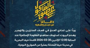 بِسْمِ اللَّـهِ الرحمن الرَّحِيمِ ﴿أُذِنَ لِلَّذِينَ يُقَاتَلُونَ بِأَنَّهُمْ ظُلِمُوا وَإِنَّ اللَّهَ عَلَىٰ نَصْرِهِمْ لَقَدِيرٌ﴾ صَدَقَ اللهُ العَلِيّ العَظِيم دفاعًا عن لبنان وشعبه، وردًّا على تمادي العدوّ في قصف المدنيّين والتهجير وهدم البيوت، استهدف مجاهدو المُقاومة الإسلاميّة عند الساعة 12:00 الإثنين 30-03-2026 قاعدة حيفا البحرية في مدينة حيفا المُحتلة بصليةٍ من الصواريخ النوعيّة. ﴿وَمَا النَّصْرُ إِلاَّ مِنْ عِندِ اللّهِ الْعَزِيزِ الْحَكِيم﴾ …