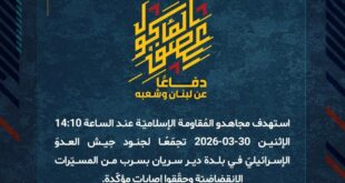 بِسْمِ اللَّـهِ الرحمن الرَّحِيمِ ﴿أُذِنَ لِلَّذِينَ يُقَاتَلُونَ بِأَنَّهُمْ ظُلِمُوا وَإِنَّ اللَّهَ عَلَىٰ نَصْرِهِمْ لَقَدِيرٌ﴾ صَدَقَ اللهُ العَلِيّ العَظِيم دفاعًا عن لبنان وشعبه، استهدف مجاهدو المُقاومة الإسلاميّة عند الساعة 14:10 الإثنين 30-03-2026 تجمّعًا لجنود جيش العدوّ الإسرائيليّ في بلدة دير سريان بسرب من المسيّرات الانقضاضيّة وحقّقوا إصابات مؤكّدة. ﴿وَمَا النَّصْرُ إِلاَّ مِنْ عِندِ اللّهِ الْعَزِيزِ الْحَكِيم﴾ الإثنين 30-03-2026 10 شوال 1447 …