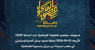 بِسْمِ اللَّـهِ الرحمن الرَّحِيمِ ﴿أُذِنَ لِلَّذِينَ يُقَاتَلُونَ بِأَنَّهُمْ ظُلِمُوا وَإِنَّ اللَّهَ عَلَىٰ نَصْرِهِمْ لَقَدِيرٌ﴾ صَدَقَ اللهُ العَلِيّ العَظِيم دفاعًا عن لبنان وشعبه، استهدف مجاهدو المُقاومة الإسلاميّة عند الساعة 18:00 الأربعاء 01-04-2026 تجمّعًا لجنود جيش العدوّ الإسرائيليّ في ملعب مدرسة دير سريان بمسيّرة انقضاضيّة. ﴿وَمَا النَّصْرُ إِلاَّ مِنْ عِندِ اللّهِ الْعَزِيزِ الْحَكِيم﴾ الأربعاء 01-04-2026 12 شوال 1447 هـ #معركة_العصف_المأكول #دفاعا_عن_لبنان_وشعبه