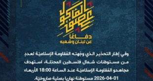 بِسْمِ اللَّـهِ الرحمن الرَّحِيمِ ﴿أُذِنَ لِلَّذِينَ يُقَاتَلُونَ بِأَنَّهُمْ ظُلِمُوا وَإِنَّ اللَّهَ عَلَىٰ نَصْرِهِمْ لَقَدِيرٌ﴾ صَدَقَ اللهُ العَلِيّ العَظِيم دفاعًا عن لبنان وشعبه، وفي إطار التحذير الذي وجّهته المُقاومة الإسلاميّة لعددٍ من مستوطنات شمال فلسطين المحتلة، استهدف مجاهدو المُقاومة الإسلاميّة عند الساعة 18:00 الأربعاء 01-04-2026 مستوطنة نهاريا بصلية صاروخيّة. ﴿وَمَا النَّصْرُ إِلاَّ مِنْ عِندِ اللّهِ الْعَزِيزِ الْحَكِيم﴾ الأربعاء 01-04-2026 12 شوال …