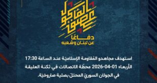 بِسْمِ اللَّـهِ الرحمن الرَّحِيمِ ﴿أُذِنَ لِلَّذِينَ يُقَاتَلُونَ بِأَنَّهُمْ ظُلِمُوا وَإِنَّ اللَّهَ عَلَىٰ نَصْرِهِمْ لَقَدِيرٌ﴾ صَدَقَ اللهُ العَلِيّ العَظِيم دفاعًا عن لبنان وشعبه، استهدف مجاهدو المُقاومة الإسلاميّة عند الساعة 17:30 الأربعاء 01-04-2026 محطّة الاتصالات في ثكنة العليقة في الجولان السوريّ المحتلّ بصلية صاروخيّة. ﴿وَمَا النَّصْرُ إِلاَّ مِنْ عِندِ اللّهِ الْعَزِيزِ الْحَكِيم﴾ الأربعاء 01-04-2026 12 شوال 1447 هـ #معركة_العصف_المأكول #دفاعا_عن_لبنان_وشعبه