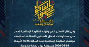 بِسْمِ اللَّـهِ الرحمن الرَّحِيمِ ﴿أُذِنَ لِلَّذِينَ يُقَاتَلُونَ بِأَنَّهُمْ ظُلِمُوا وَإِنَّ اللَّهَ عَلَىٰ نَصْرِهِمْ لَقَدِيرٌ﴾ صَدَقَ اللهُ العَلِيّ العَظِيم دفاعًا عن لبنان وشعبه، وفي إطار التحذير الذي وجّهته المُقاومة الإسلاميّة لعددٍ من مستوطنات شمال فلسطين المحتلة، استهدف مجاهدو المُقاومة الإسلاميّة عند الساعة 15:45 الأربعاء 01-04-2026 مستوطنة نهاريا بصلية صاروخيّة. ﴿وَمَا النَّصْرُ إِلاَّ مِنْ عِندِ اللّهِ الْعَزِيزِ الْحَكِيم﴾ الأربعاء 01-04-2026 12 شوال …