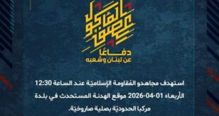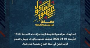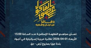 بِسْمِ اللَّـهِ الرحمن الرَّحِيمِ ﴿أُذِنَ لِلَّذِينَ يُقَاتَلُونَ بِأَنَّهُمْ ظُلِمُوا وَإِنَّ اللَّهَ عَلَىٰ نَصْرِهِمْ لَقَدِيرٌ﴾ صَدَقَ اللهُ العَلِيّ العَظِيم دفاعًا عن لبنان وشعبه، أسقط مجاهدو المُقاومة الإسلاميّة عند الساعة 13:30 الأربعاء 01-04-2026 طائرة مسيّرة تابعة لجيش العدوّ الإسرائيليّ من نوع “هرمز 450 – زیك” في أجواء بلدة عيناتا بصاروخ أرض جوّ. ﴿وَمَا النَّصْرُ إِلاَّ مِنْ عِندِ اللّهِ الْعَزِيزِ الْحَكِيم﴾ الأربعاء 01-04-2026 …
