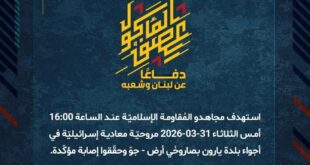 بِسْمِ اللَّـهِ الرحمن الرَّحِيمِ ﴿أُذِنَ لِلَّذِينَ يُقَاتَلُونَ بِأَنَّهُمْ ظُلِمُوا وَإِنَّ اللَّهَ عَلَىٰ نَصْرِهِمْ لَقَدِيرٌ﴾ صَدَقَ اللهُ العَلِيّ العَظِيم دفاعًا عن لبنان وشعبه، استهدف مجاهدو المُقاومة الإسلاميّة عند الساعة 16:00 أمس الثلاثاء 31-03-2026 مروحيّة معادية إسرائيليّة في أجواء بلدة يارون بصاروخَي أرض – جوّ وحقّقوا إصابة مؤكّدة. ﴿وَمَا النَّصْرُ إِلاَّ مِنْ عِندِ اللّهِ الْعَزِيزِ الْحَكِيم﴾ الأربعاء 01-04-2026 12 شوال 1447 هـ …