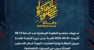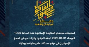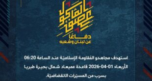 بِسْمِ اللَّـهِ الرحمن الرَّحِيمِ ﴿أُذِنَ لِلَّذِينَ يُقَاتَلُونَ بِأَنَّهُمْ ظُلِمُوا وَإِنَّ اللَّهَ عَلَىٰ نَصْرِهِمْ لَقَدِيرٌ﴾ صَدَقَ اللهُ العَلِيّ العَظِيم دفاعًا عن لبنان وشعبه، استهدف مجاهدو المُقاومة الإسلاميّة عند الساعة 08:15 الأربعاء 01-04-2026 قاعدة جبل نيريا التابعة لقاعدة ميرون للمراقبة وإدارة العمليّات الجويّة شمال فلسطين المحتلّة بسرب من المسيّرات الانقضاضيّة. ﴿وَمَا النَّصْرُ إِلاَّ مِنْ عِندِ اللّهِ الْعَزِيزِ الْحَكِيم﴾ الأربعاء 01-04-2026 12 شوال …