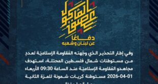 بِسْمِ اللَّـهِ الرحمن الرَّحِيمِ ﴿أُذِنَ لِلَّذِينَ يُقَاتَلُونَ بِأَنَّهُمْ ظُلِمُوا وَإِنَّ اللَّهَ عَلَىٰ نَصْرِهِمْ لَقَدِيرٌ﴾ صَدَقَ اللهُ العَلِيّ العَظِيم دفاعًا عن لبنان وشعبه، وفي إطار التحذير الذي وجّهته المُقاومة الإسلاميّة لعددٍ من مستوطنات شمال فلسطين المحتلة، استهدف مجاهدو المُقاومة الإسلاميّة عند الساعة 09:30 الأربعاء 01-04-2026 مستوطنة كريات شمونة للمرّة الثانية بصليةٍ صاروخيّة. ﴿وَمَا النَّصْرُ إِلاَّ مِنْ عِندِ اللّهِ الْعَزِيزِ الْحَكِيم﴾ الأربعاء …