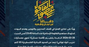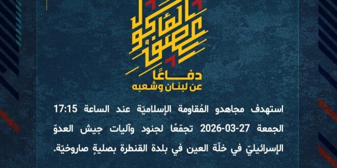 دفاعًا عن لبنان وشعبه، استهدف مجاهدو المُقاومة الإسلاميّة عند الساعة 17:15 الجمعة 27-03-2026 تجمّعًا لجنود وآليات جيش العدوّ الإسرائيليّ في خلّة العين في بلدة القنطرة بصليةٍ صاروخيّة.