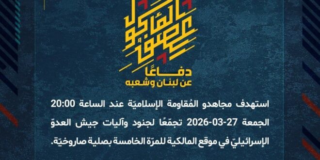 دفاعًا عن لبنان وشعبه، استهدف مجاهدو المُقاومة الإسلاميّة عند الساعة 20:00 الجمعة 27-03-2026 تجمّعًا لجنود وآليات جيش العدوّ الإسرائيليّ في موقع المالكية للمرّة الخامسة بصلية صاروخيّة.