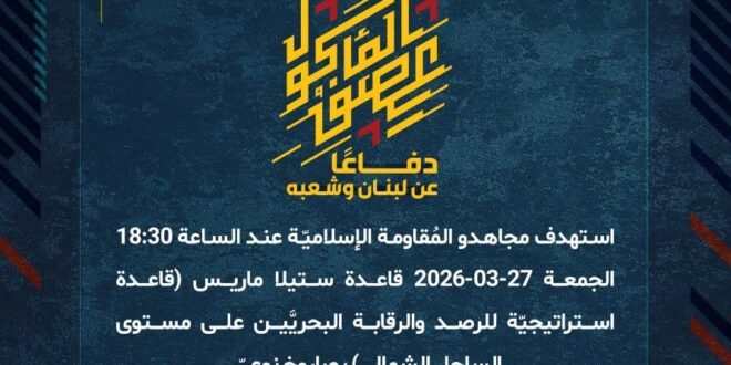 دفاعًا عن لبنان وشعبه، استهدف مجاهدو المُقاومة الإسلاميّة عند الساعة 18:30 الجمعة 27-03-2026 قاعدة ستيلا ماريس (قاعدة استراتيجيّة للرصد والرقابة البحريَّين على مستوى الساحل الشمالي) بصاروخ نوعيّ.